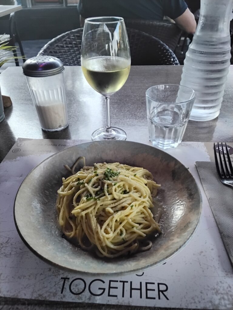 Ruokapaikka löytyi kadun toiselta puolelta, otin spagetin ja lasin kuivaa valkoviiniä. Muutaman pienen sämpylän toivat myös ja sain itseni kylläiseksi.
